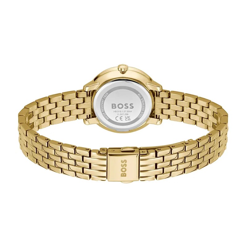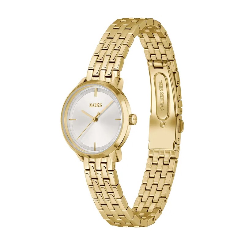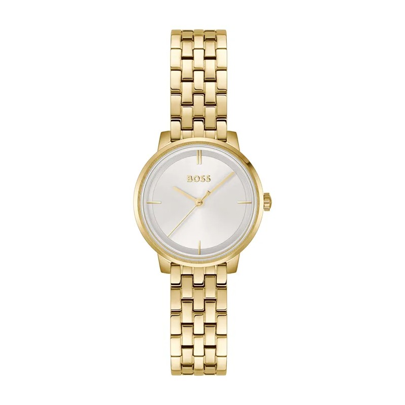 BOSS Lucia 1502835 on elegantti ja ajaton rannekello, joka huokuu hienostuneisuutta ja klassista tyyliä. Sen kullanvärinen 28 mm runko on valmistettu kestävästä ruostumattomasta teräksestä, ja kellon minimalistista ilmettä korostaa tyylikäs hopeanvärinen taulu, joka tekee siitä monipuolisen asusteen kaikkiin tilanteisiin. Luotettava kvartsikoneisto takaa tarkan ajanoton, ja taulua suojaa kestävä mineraalilasi. Kello on 30 metrin vesitiivis, joten se kestää roiskeet ja kevyen veden kanssa kosketuksen, tehden siitä käytännöllisen arjen kumppanin.