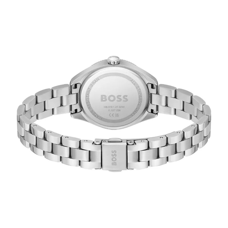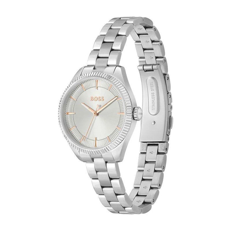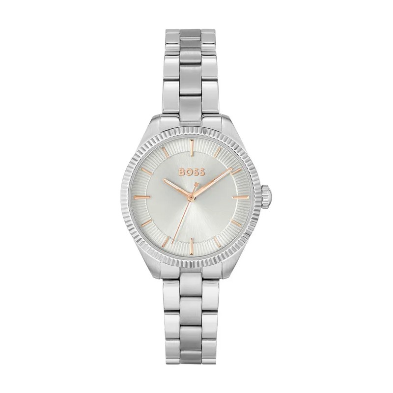 Boss Sage 1502726 -kello on tyylikäs kokonaisuus naisille. Kellon runko on 32 mm leveä tehden siitä varsin siron. Kellon ruostumattomasta teräksestä valmistetun rannekkeen leveys kiinnityskohdasta on 14 mm. Kellon hopeanväristä taulua suojaa kestävä mineraalilasi. Boss-kelloille myönnetään 2 vuoden takuu ja ne toimitetaan valmistajan alkuperäisessä pakkauksessa.